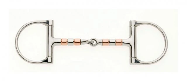 The D cheek copper roller snaffle is often used for horses that need something stronger than a jointed bit if they lean or try to grab the bit. Alternating stainless steel and copper rollers set along the mouthpiece of the snaffle.