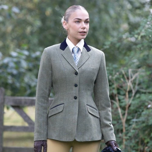 Exclusive Equetech Green herringbone tweed with subtle Red, Orange and Blue overcheck. Perfect for all equestrian activities including Showing, Cubbing and Riding Club activities. Features include Flap pockets with concealed zip pockets, rich gold Equetech jacquard lining, rich Navy velvet collar and pocket welts, foxhead buttons and double back vents. 60% Wool/ 40% Polyester. 400gsm.