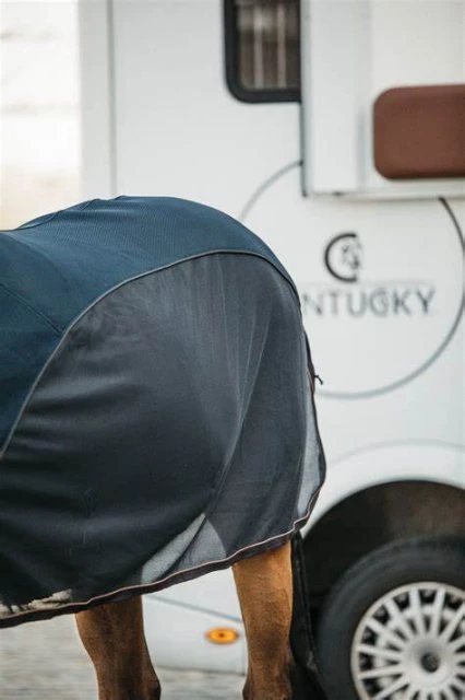 The Mesh Combo Cooler Sheet can be used for multiple purposes in the field, at the stable and during transport. Ideal for cooling down thanks to its very light and breathable fabrics. This also makes the rug perfect for drying your horse after training or bathing during spring or summer. The cooler sheet is a combination of the fly sheet and the 3D spacer. On the back part: the 3D spacer, a light but strong honeycomb structure, will absorbs the sweat while keeping your horse dry. On the lower part: the Mesh fly sheet fabric does not only prevent bugs from bothering your horse but will also help air circulation. Which will gradually cool your horse down. The materials used for the Mesh Combo are specially designed, so hair doesn’t stick to it. which makes the cooler sheet very comfortable to wear. The rug is anatomically shaped at the back and has a flat-lined shoulder to make the rug fit nicely to the shape of the horse. For extra comfort, we added artificial sheepskin at the withers and removable surcingles. So, you can easily turn the rug into a showrug by removing the detachable surcingles. Additionally, we added our signature brown piping and the Kentucky logo in artificial leather for a luxurious look. – Absorbs sweat and water, while keeping your horse warm – Fits nicely to the shape of the horse – Hair doesn’t stick to the rug – Luxurious look and feel – 3D spacer technology Care guide for the Mesh Combo Cooler Sheet: You can easily machine wash the Mesh Combo Cooler Sheet at 30°. Do not tumble dry afterwards.