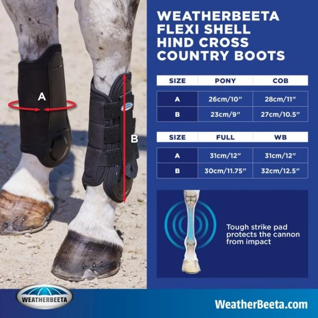 The WeatherBeeta Flexi Shell Hind Cross Country Boots are lightweight and tough, with a flexible strike pad that contours to the horseÆs leg creating the perfect fit. With a breathable, microperforated neoprene lining, it does not carry water, which keeps the boots continuously lightweight. These cross country boots are shaped to the leg and moulds around the fetlock area without restricting the natural action of the horse’s movement for comfort and protection. Air vents in the outer shell assist in keeping the tendons and ligaments cool, whilst the double adjustable touch tape closures with press stud button ensure a secure fit.